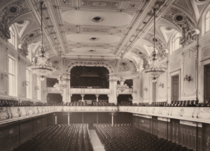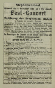 Das Programm des Eröffnungskonzerts am 4. November 1885 mag uns heute wie ein Potpourri erscheinen, im späten 19. Jahrhundert war die Kombination vieler unterschiedlich besetzter Werke jedoch gang und gäbe. Neben der Freischütz-Ouvertüre von Carl Maria von Weber erklang eine Arie aus Mozarts Entführung aus dem Serail, dazu eine Orgelpassacaglia von Bach sowie Beethovens 9. Symphonie als Krönung des Abends. Vorgetragen wurde auch ein von Robert Hamerling verfasster Prolog. Erzherzogin Stephanie war bei der Eröffnung selbst übrigens nicht anwesend, wie oft erzählt wird, allerdings besuchte das Kronprinzenpaar 1887 ein Konzert im Stefaniensaal.
